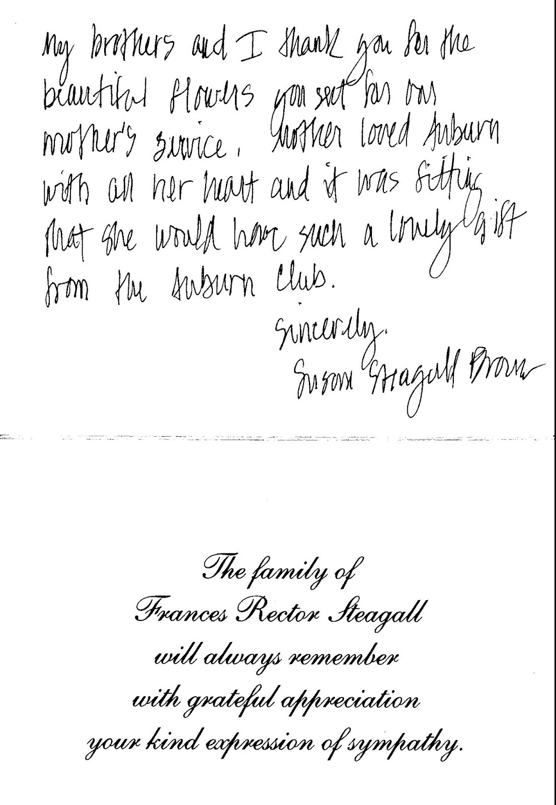 The Dale County Auburn Club will greatly miss Mrs. Frances Steagall. She has been a member of the club since it began and has been a continual supporter of Auburn and The Dale County Auburn Club. Flowers were sent from the club and a donation was made to the Methodist Church Meditation Garden in her memory. Below are two thank you notes from Susan Steagall Brown and the family of Mrs. Steagall.